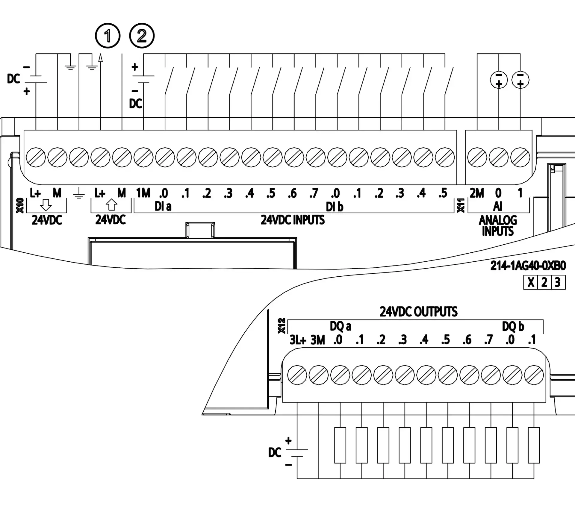 Trong PLC Siemens S7-1200 CPU 1214C DC/DC/DC, các chân đấu nối được chia thành ba khối terminal chính ký hiệu là X10, X11 và X12. Việc hiểu rõ sơ đồ chân này giúp bạn tránh đấu nhầm nguồn gây cháy nổ hoặc hỏng ngõ ra bán dẫn.